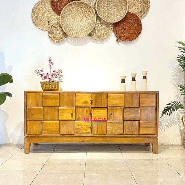 Buffet ini terbuat dari kayu jati solid berkualitas tinggi yang dikenal kuat, awet, dan memiliki serat alami yang indah. Dengan desain pola kotak geometris pada bagian depan, produk ini memberikan sentuhan modern namun tetap natural, cocok untuk berbagai gaya interior — dari klasik hingga kontemporer.